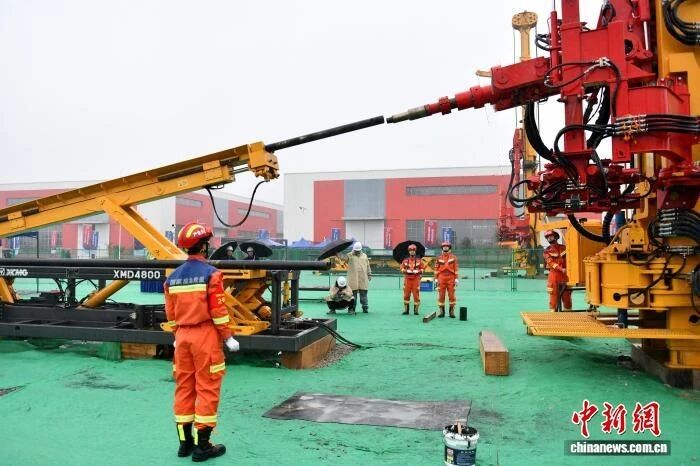 国家矿山应急救援山东特勘队参赛队员正在进行车载钻机实操比赛