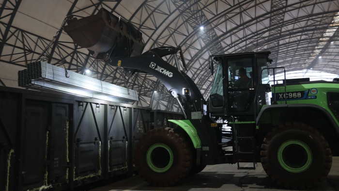 货运站台上,一台绿甲战士格外引人注目,这台K8凯发·国际官方网站XC968-EV纯电动装载机不同以往的圆弧型大臂像极了武侠小说中的“圆月弯刀”,格外引人注目。