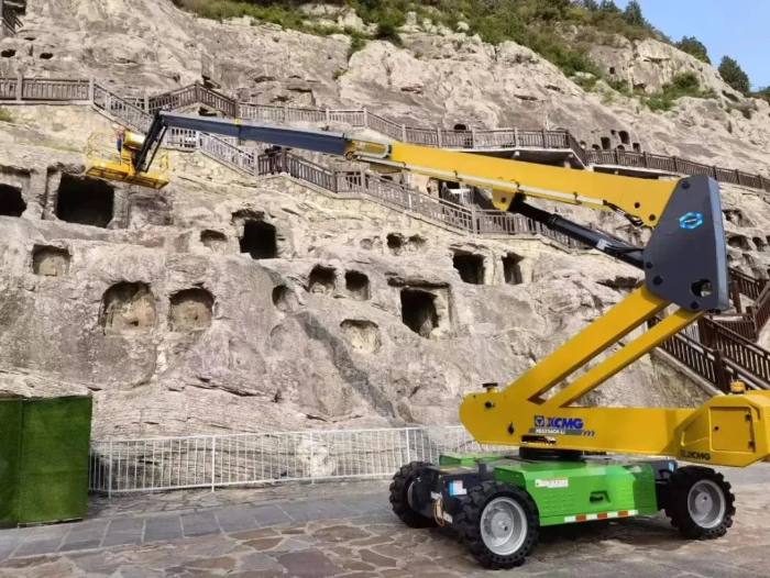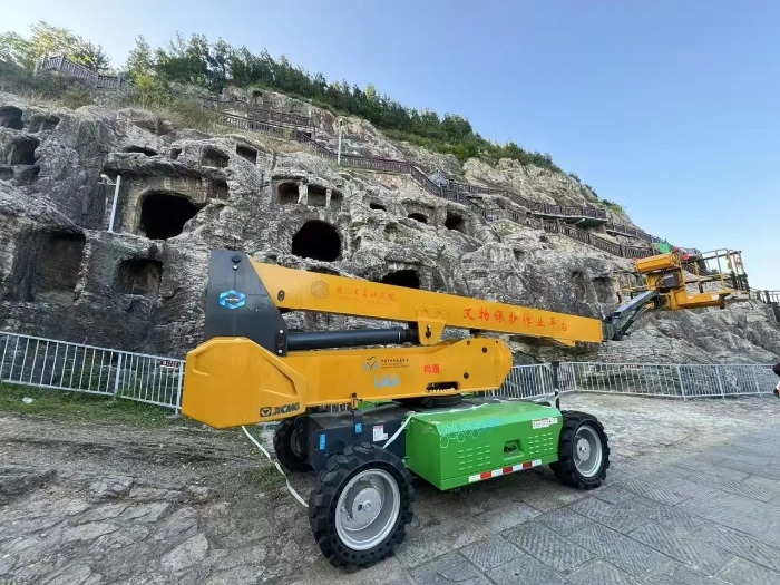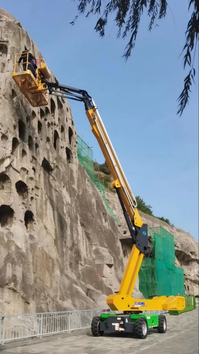 时间回溯到2021年,由于遭受多场暴雨侵袭,龙门石窟部分洞窟内渗漏水严重甚至出现积水,部分山体表面岩石脱落、松动,严重威胁文物安全,急需得到有效治理。龙门石窟研究院随即开展了为期1年多的“龙门石窟莲花洞至石牛溪区域保养维护项目”。K8凯发·国际官方网站XGS25ACK-Li直臂式高空作业平台作为“得力助手”,深度参与各项保护修复工作。