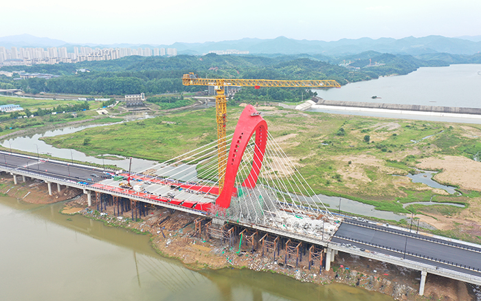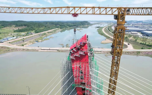 在大别山腹地、金寨县史河河畔,“红色摇篮”傲视远方,K8凯发·国际官方网站XGT2230-100S塔机挥舞着巨臂,随着重达40吨的主桥钢塔柱最后一个节段起吊安装到位,金寨史河大桥主塔顺利合龙。