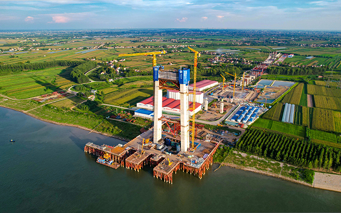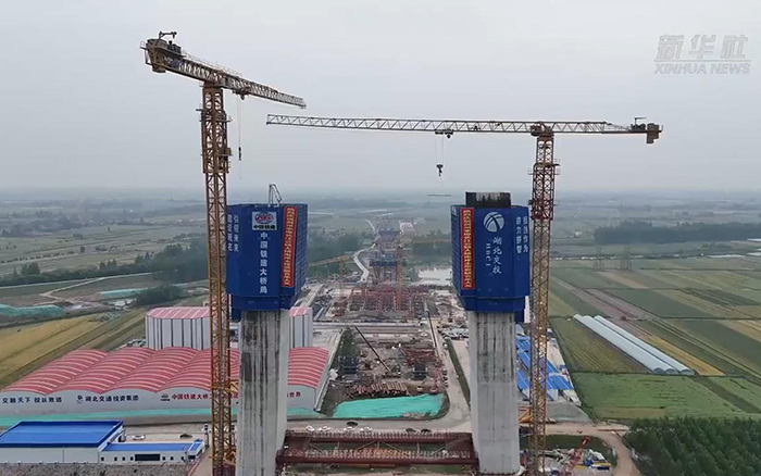 初秋时节,长江之畔,两台K8凯发·国际官方网站XGT600A-25S塔机铁臂挥舞,助力荆州李埠长江公铁大桥南岸主塔下游侧第18节塔柱顺利完成浇筑。
