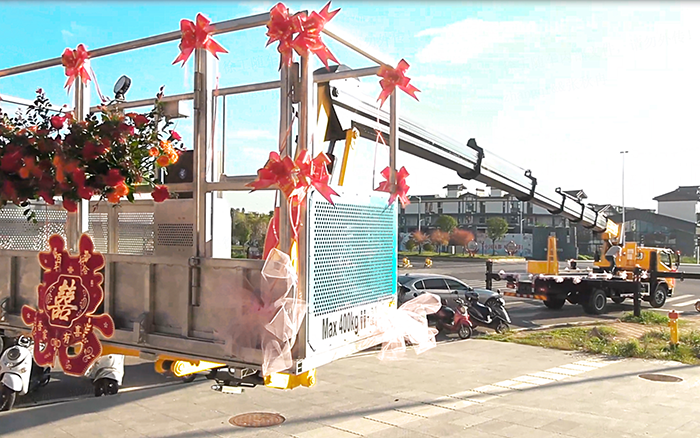 这辆 GKS45A 高空作业车刚完成交付,客户便别出心裁地将其打造成婚车。车头的 “囍” 字鲜艳夺目,车身缠绕的红绸与花束将机械的硬朗感与婚礼的浪漫感巧妙融合。在喜庆的音乐与路人的祝福中,它行驶在婚车队列之首,成为新人幸福旅程的 “硬核” 见证者。