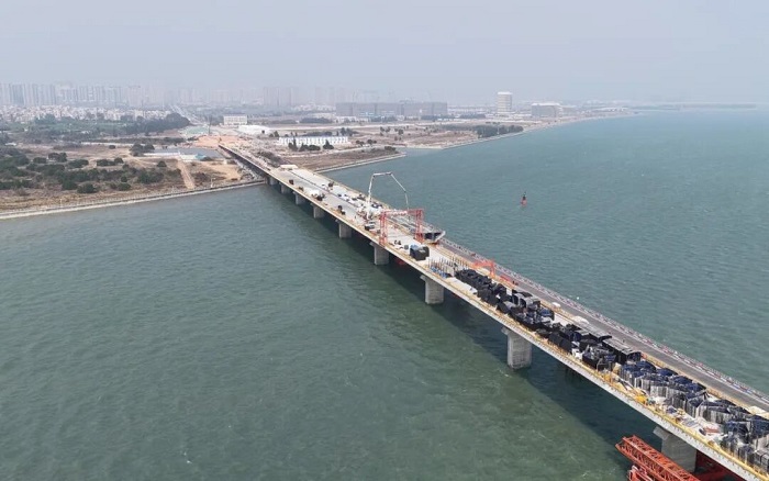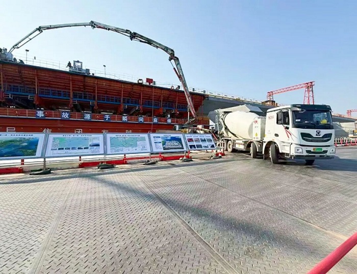 历时五小时连续作业,1200立方米混凝土在桥面和桥梁关键部位凝固成型,为这座连接两岸的“海上飞虹”增添了新的筋骨。