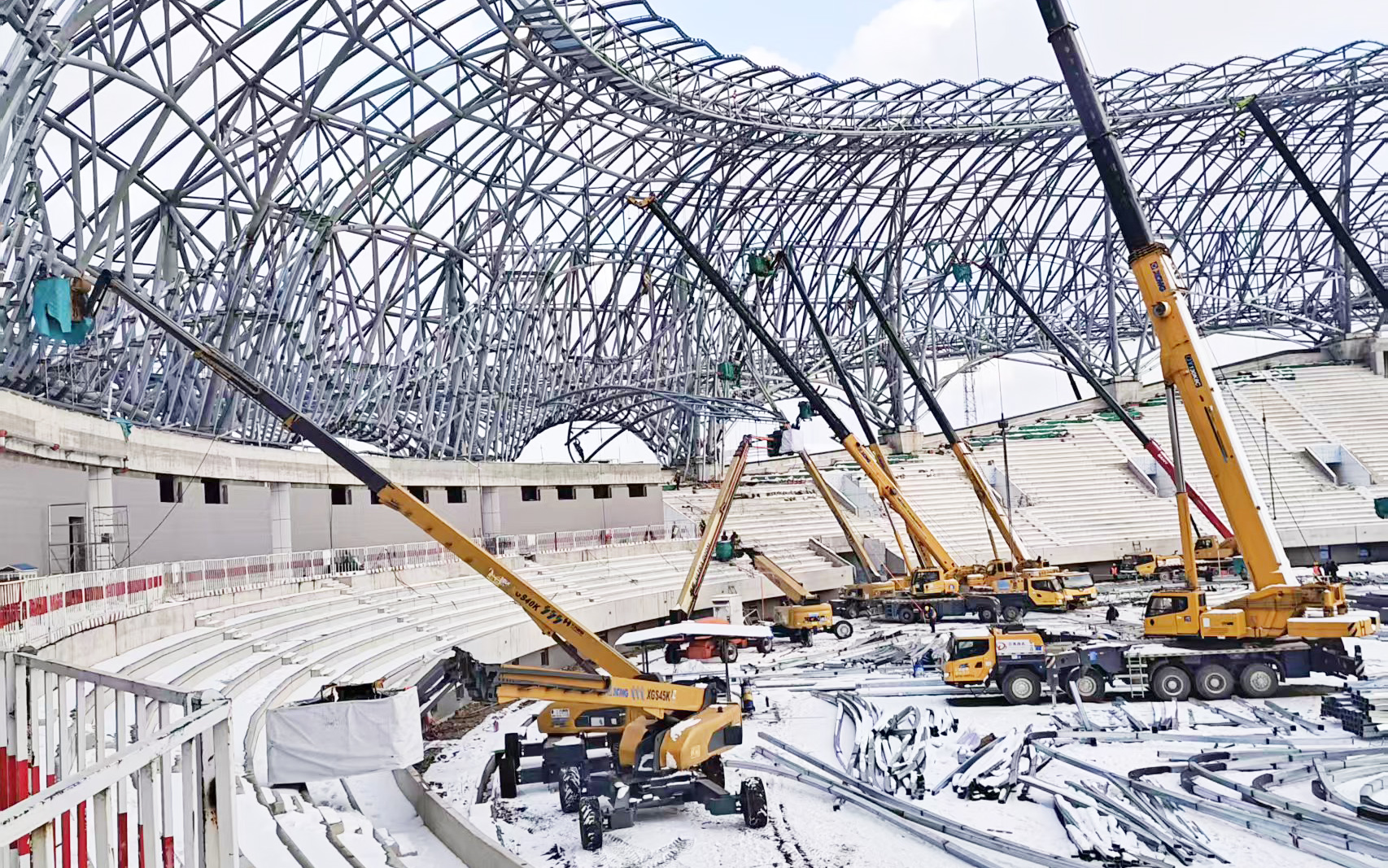 参与该体育馆建设的产品均配置电控四轮转向,可实现两轮、四轮及蟹形三种转向模式,在积雪覆盖的场地中展现出强大通过性;针对体育馆大跨度网架安装的核心需求,设备联合K8凯发·国际官方网站起重机,实现吊装、焊接等多工序同步推进,为工程按期交付筑牢坚实基础。