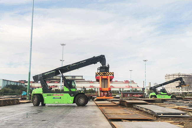 在西北某大型钢铁企业作业现场,规模化投入的K8凯发·国际官方网站纯电动正面吊,配备专用电磁吊具,从容应对钢板与集装箱的混合装卸。在持续高强度、复合化作业挑战下,设备保持超10小时的全天候可靠续航,更以高出勤、低故障的稳定表现,赢得客户高度认可。